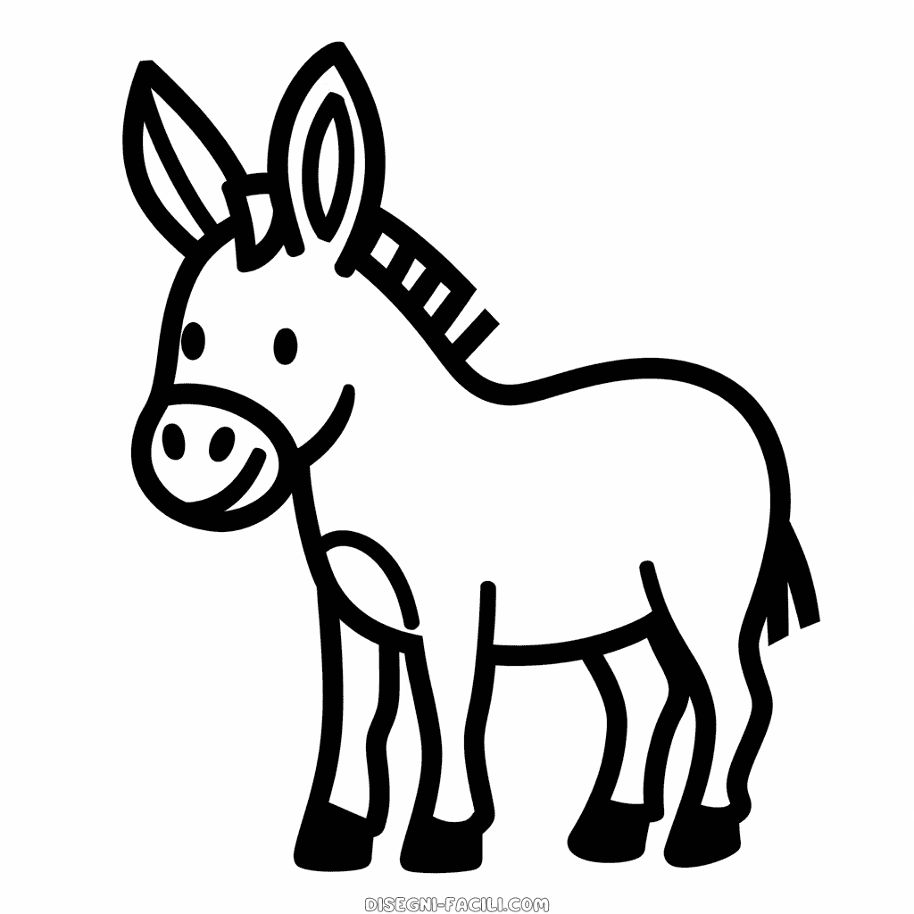 Disegno facile di Asino per bambino da stampare gratuitamente, un simpatico asinello perfetto da colorare e imparare a disegnare passo dopo passo. Scheda semplice da ricalcare o colorare per bambini. Immagine ad alta risoluzione, perfetta per la stampa in PDF in bianco e nero formato A4.