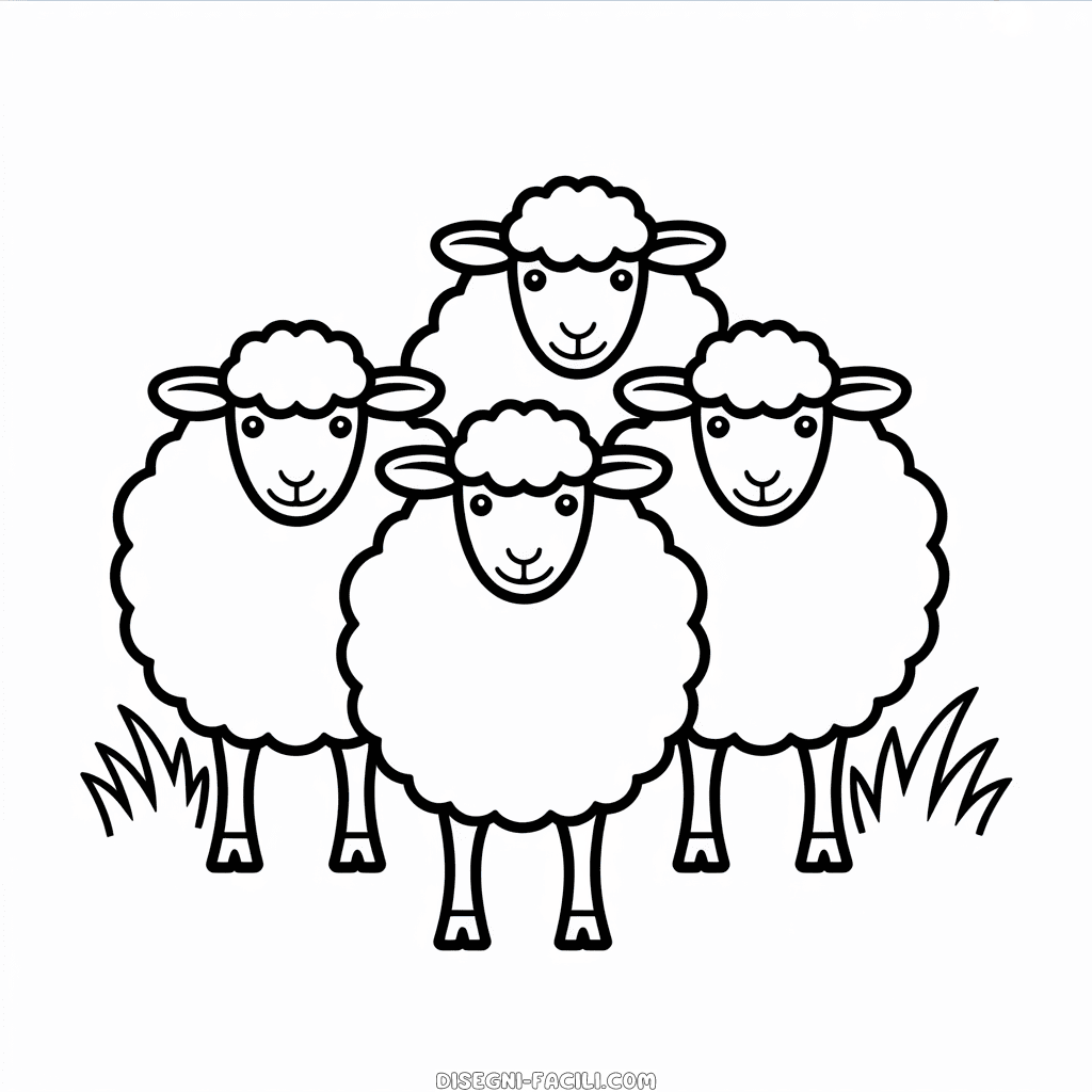 Disegno facile di gruppo di pecore da stampare gratuitamente, un’immagine adorabile di un piccolo gregge perfetto per stimolare la creatività dei bambini. Scheda semplice da ricalcare o colorare per bambini. Immagine ad alta risoluzione, perfetta per la stampa in PDF in bianco e nero formato A4.